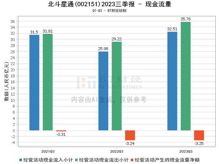 综上所述,北斗星通公司2023年三季度在资产总计、负债合计、净资产和营业收入等方面均有所增长,但营业利润、净利润、毛利率和净利率等方面表现不佳,显示出公司的盈利能力受到一定压力。在现金流量方面,公司的经营活动现金流入有所增长,但经营活动现金流出也有所增长。