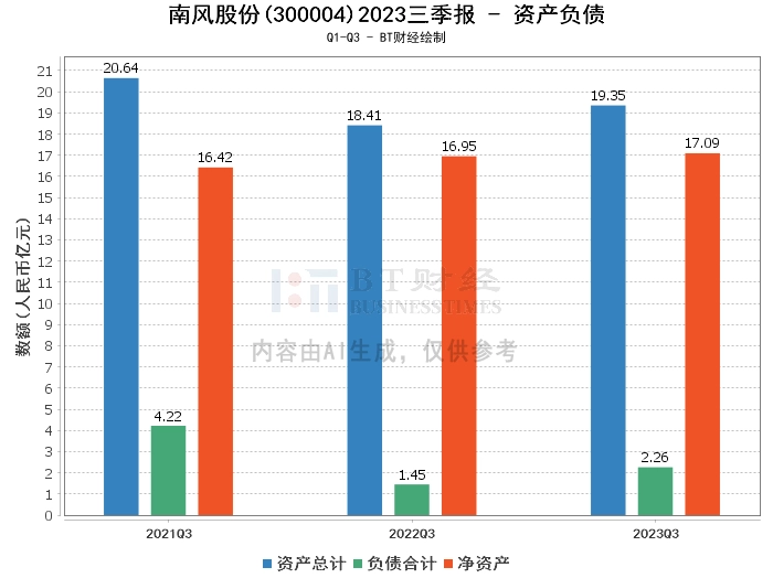 在资产负债方面,南风股份2023年三季度末的总资产为19.35亿元,相比上年度末的19.12亿元有所增长。负债合计为2.26亿元,略高于上年度末的2.1亿元。净资产为17.09亿元,较上年度末的17.02亿元有所提升。资产负债率为11.7%,较上年度末的10.98%有所上升。
