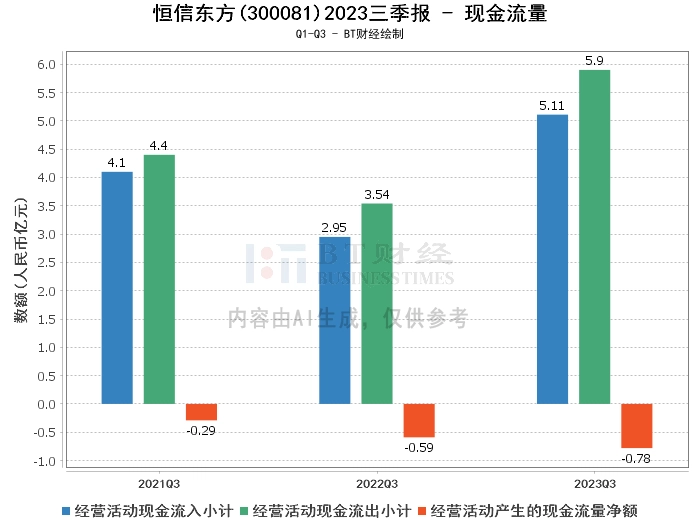 在现金流量方面,恒信东方2023年1-9月的经营活动现金流入小计为5.11亿元,同比增长73.56%,主要是因为本报告期销售商品提供劳务收到的现金较上期增加所致。经营活动现金流出小计为5.9亿元,同比增长66.65%,主要是因为本报告期购买商品提供劳务支付的现金较上期增加所致。经营活动产生的现金流量净额为-7842.74万元,同比减少32.28%,主要是因为购买商品和支付工资增加的现金支出较销售收款增加的现金支出多所致。