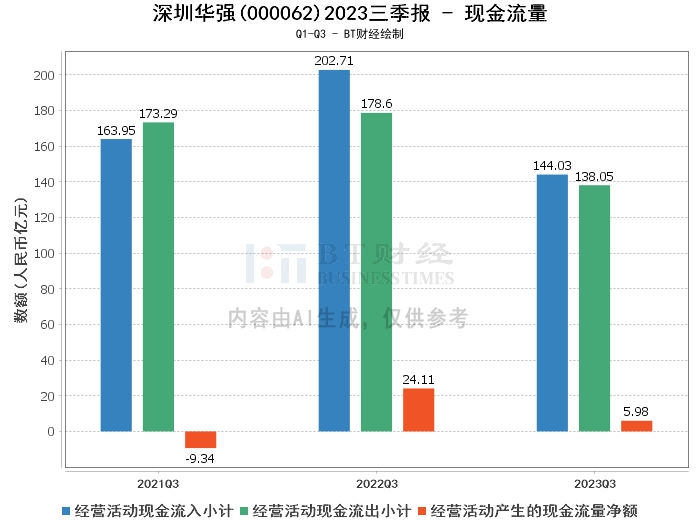 在现金流量方面,深圳华强2023年前三季度经营活动产生的现金流量净额为5.98亿元,较上年同期的24.11亿元有所减少。经营活动现金流入小计为144.03亿元,较上年同期的202.71亿元有所下降。经营活动现金流出小计为138.05亿元,较上年同期的178.59亿元有所减少。