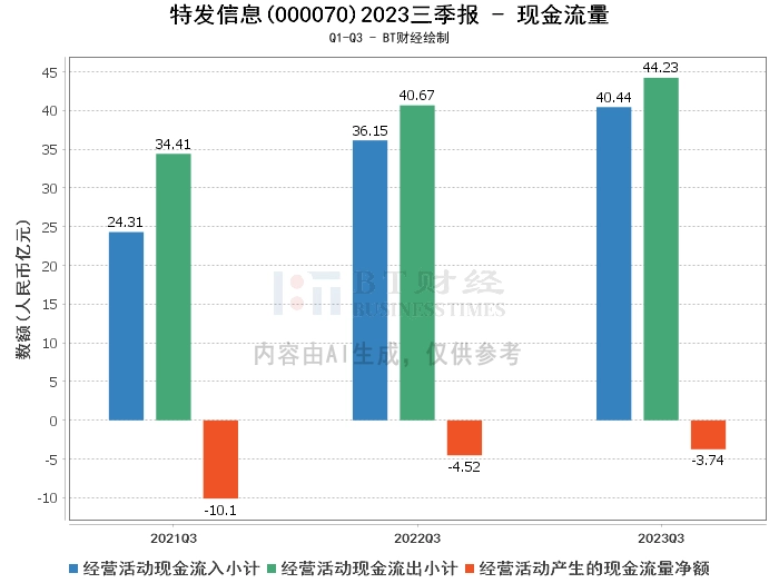 再次,从现金流量方面来看,特发信息2023年三季度的经营活动现金流入小计为40.44亿元,较上年同期的36.15亿元有所增长。经营活动现金流出小计为44.23亿元,较上年同期的40.67亿元有所增加。这表明公司的经营活动现金流入有所增加,但现金流出也在增加,现金流压力较大。