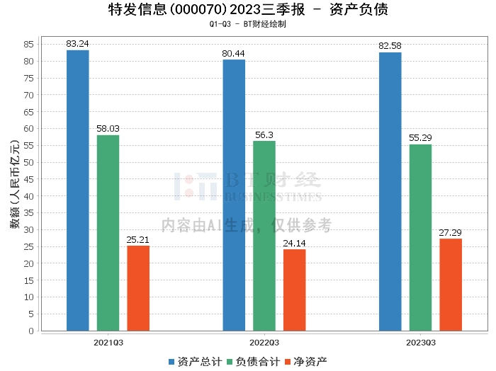 首先,从资产负债方面来看,特发信息2023年三季度的资产总计为82.58亿元,相比上年度末的78.73亿元有所增长。负债合计为55.29亿元,与上年度末的55.07亿元相比略有增加。净资产为27.29亿元,较上年度末的23.66亿元有所提升。资产负债率为66.95%,较上年度末的69.95%有所下降。这表明公司的资产规模在扩大,负债规模基本稳定,净资产有所增加,资产负债结构有所优化。