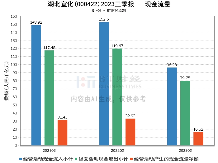综上所述,湖北宜化2023年三季度的经营状况呈现出一定的压力,营业收入、营业利润、净利润和现金流量净额均有所下降,但总资产和净资产均实现了增长,资产负债率也有所下降,显示出公司在资产管理方面的效果。