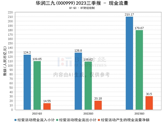 在现金流量方面,华润三九2023年三季度的经营活动产生的现金流量净额为30.5亿元,相比上年同期的20.18亿元有所增长。经营活动现金流入小计为210.17亿元,相比上年同期的128.8亿元有所增长。经营活动现金流出小计为179.67亿元,相比上年同期的108.62亿元有所增长。
