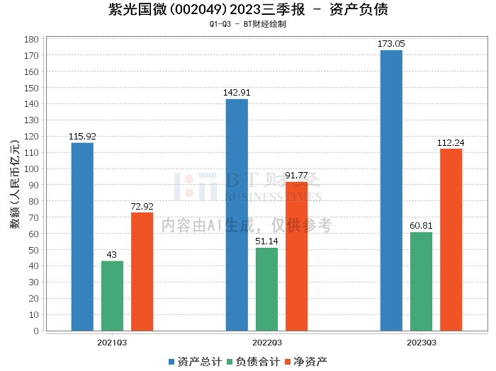在资产负债方面,紫光国微2023年三季度的资产总计达到173.05亿元,相比上年度末的153.29亿元增长了12.89%。负债合计为60.81亿元,相比上年度末的55.54亿元有所增加。公司的净资产为112.24亿元,相比上年度末的97.75亿元增长了14.92%。资产负债率为35.14%,相比上年度末的36.23%有所下降。