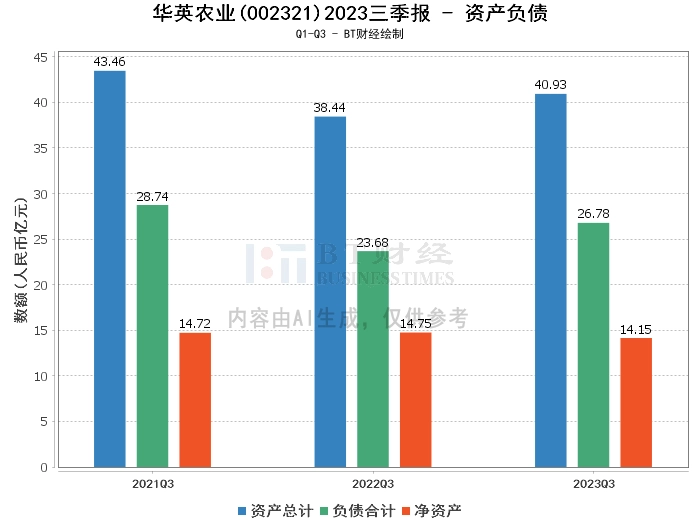 在资产负债方面,华英农业2023年三季度的总资产为40.93亿元,相比上年度末的35.37亿元有所增加。负债合计为26.78亿元,相比上年度末的21.73亿元也有所增长。净资产为14.15亿元,较上年度末的13.65亿元略有增长。资产负债率为65.43%,较上年度末的61.42%有所提高。