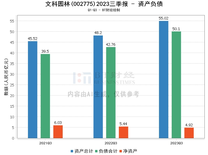 在资产负债方面,文科园林2023年三季度末的资产总计为55.02亿元,较上年度末的50.12亿元有所增长。负债合计为50.1亿元,相比上年度末的47.8亿元也有所上升。公司的净资产为4.92亿元,较上年度末的2.32亿元有显著提升。资产负债率为91.06%,相比上年度末的95.37%有所下降。