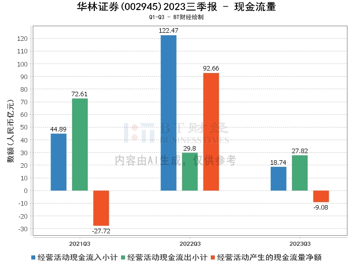 在现金流量方面,公司2023年三季度经营活动产生的现金流量净额为-9.08亿元,较上年同期的92.66亿元大幅下降,主要是由于回购业务资金净流入额减少。