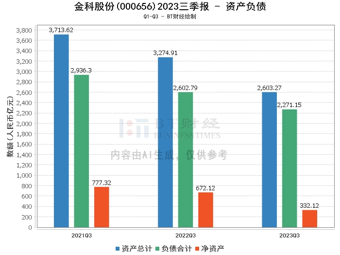 在资产负债方面,金科股份2023年三季度的总资产为2603.27亿元,相比上年度末的2995.36亿元有所下降。负债合计为2271.15亿元,相比上年度末的2606.49亿元也有所减少。净资产为332.12亿元,较上年度末的388.86亿元有所减少。资产负债率为87.24%,略高于上年度末的87.02%。