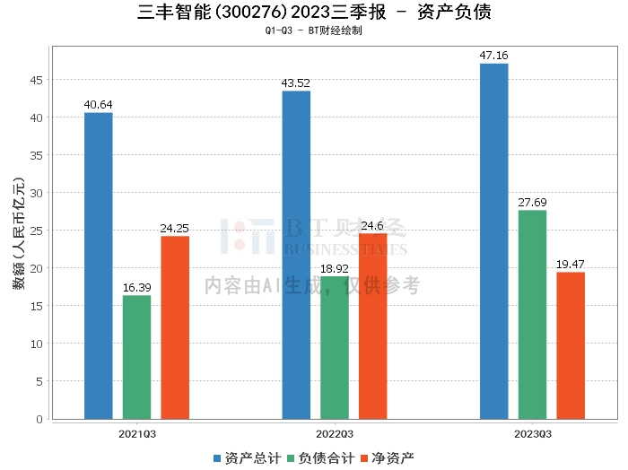 在资产负债方面,2023年三季度,三丰智能的资产总计为47.16亿元,相比上年度末的40.05亿元有所增长。负债合计为27.69亿元,相比上年度末的20.87亿元有所增加。公司的净资产为19.47亿元,略高于上年度末的19.18亿元。资产负债率为58.71%,相比上年度末的52.11%有所上升。