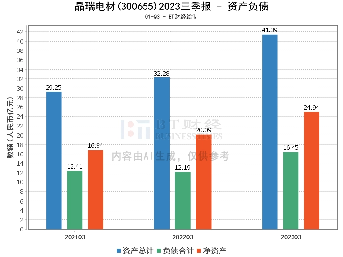 在资产负债方面,晶瑞电材2023年三季度末的总资产为41.39亿元,相比上年度末的32.16亿元增长了28.72%。负债合计为16.45亿元,相比上年度末的11.85亿元增长了38.82%。净资产为24.94亿元,相比上年度末的20.31亿元增长了22.77%。资产负债率为39.75%,相比上年度末的36.85%有所上升。
