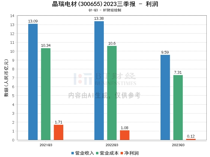 在利润方面,晶瑞电材2023年1-9月的营业收入为9.59亿元,相比上年同期的13.38亿元下降了28.30%。营业成本为7.31亿元,相比上年同期的10.6亿元下降了31.06%。营业利润为-734.29万元,相比上年同期的1.23亿元下降了105.95%。净利润为1161.24万元,相比上年同期的1.08亿元下降了89.37%。这些变化主要系本期营业收入下降所致。
