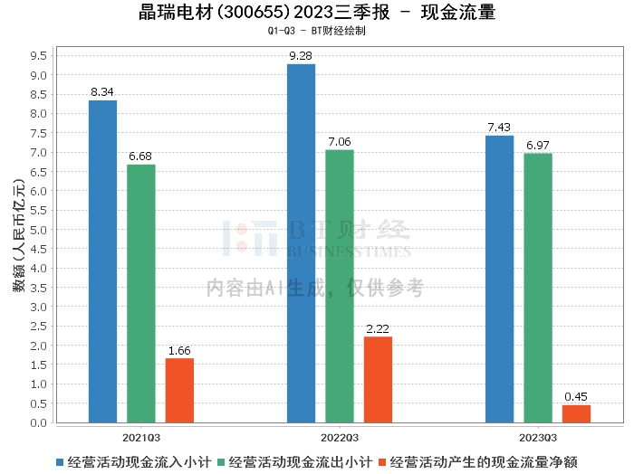 在现金流量方面,晶瑞电材2023年1-9月经营活动产生的现金流量净额为4532.23万元,相比上年同期的2.22亿元下降了79.56%。经营活动现金流入小计为7.43亿元,相比上年同期的9.28亿元下降了19.87%。经营活动现金流出小计为6.97亿元,相比上年同期的7.06亿元下降了1.27%。这些变化主要系本期销售回笼款项下降所致。