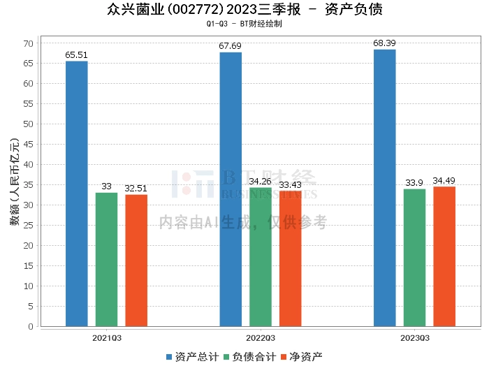 从2023年三季报中,我们可以看到众兴菌业的总资产在本报告期末达到68.39亿元,相比上年度末的65.69亿元有所增长。同时,公司的负债合计也有所上升,从上年度末的31.84亿元增至本报告期末的33.9亿元。净资产方面,本报告期末为34.49亿元,较上年度末的33.85亿元略有增加。资产负债率在本报告期末为49.57%,相比上年度末的48.48%有所上升。
