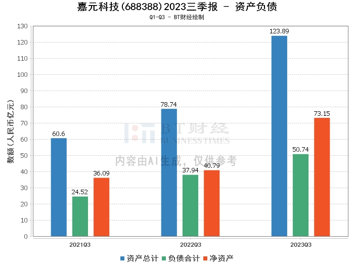 在资产负债方面,嘉元科技2023年三季度的总资产为123.89亿元,相比上年度末的107.96亿元增长了14.76%。负债合计为50.74亿元,较上年度末的33.92亿元增长较大。净资产为73.15亿元,相比上年度末的74.04亿元略有下降。资产负债率为40.96%,较上年度末的31.42%有所上升。