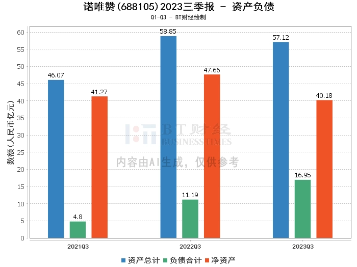 在资产负债方面,2023年三季度末,诺唯赞的总资产为57.12亿元,相比上年度末的60.05亿元有所下降。负债合计为16.95亿元,较上年度末的13.93亿元有所增加。净资产为40.18亿元,较上年度末的46.12亿元有所减少。资产负债率为29.67%,较上年度末的23.2%有所上升。