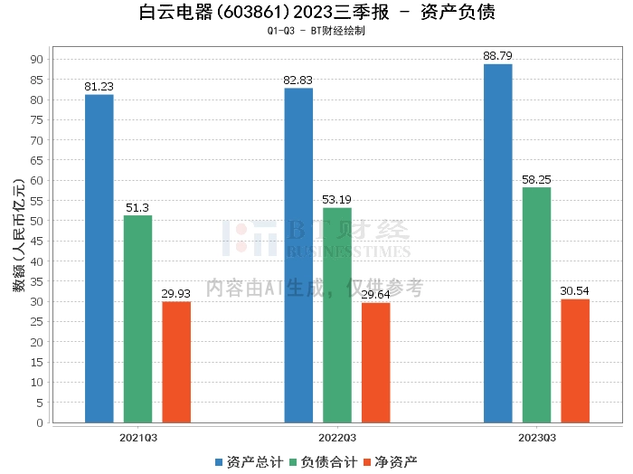 从资产负债方面来看,白云电器2023年三季度的总资产为88.79亿元,相比上年度末的85.11亿元有所增长。负债合计为58.25亿元,较上年度末的55.01亿元有所上升。净资产为30.54亿元,较上年度末的30.1亿元略有增加。资产负债率为65.6%,略高于上年度末的64.64%。