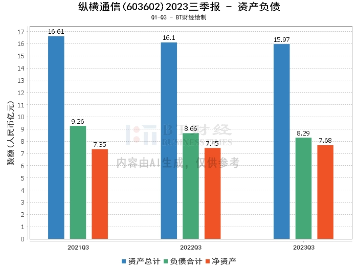 在资产负债方面,纵横通信公司2023年三季度末的总资产为15.97亿元,相较于上年度末的15.91亿元略有增长。负债合计为8.29亿元,较上年度末的8.41亿元有所下降。净资产为7.68亿元,较上年度末的7.5亿元有所增长。资产负债率为51.9%,较上年度末的52.86%有所降低。
