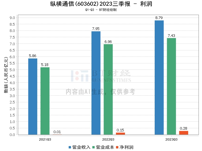 在利润方面,纵横通信公司2023年三季度的营业收入为8.79亿元,较上年同期的7.95亿元增长10.49%。营业利润为2773.13万元,较上年同期的1514.84万元增长。营业成本为7.43亿元,较上年同期的6.96亿元有所增长。净利润为2763.3万元,较上年同期的1531.97万元增长。