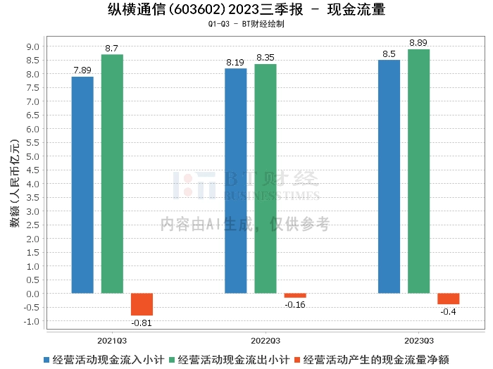 在现金流量方面,纵横通信公司2023年三季度的经营活动现金流入小计为8.5亿元,较上年同期的8.19亿元有所增长。经营活动现金流出小计为8.89亿元,较上年同期的8.35亿元有所增长。