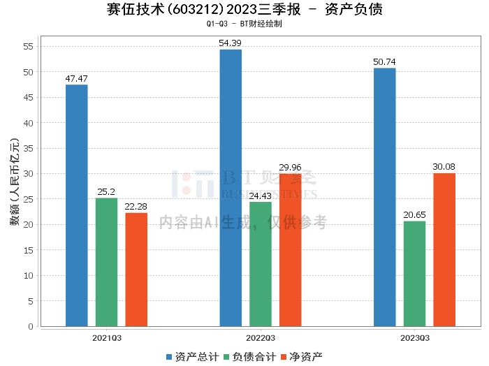 从资产负债方面看,赛伍技术2023年三季度末的总资产为50.74亿元,相较于上年度末的49.74亿元有所增长。负债合计为20.65亿元,略高于上年度末的20.06亿元。净资产为30.08亿元,较上年度末的29.68亿元有所提升。资产负债率为40.71%,略高于上年度末的40.33%。