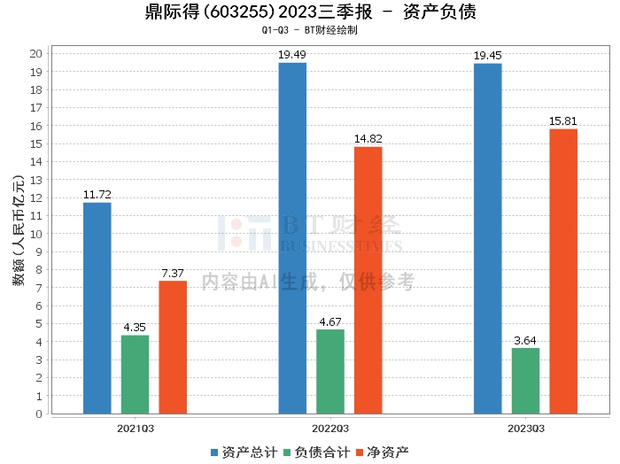 从资产负债方面来看,鼎际得2023年三季度末的总资产为19.45亿元,相较于上年度末的17.62亿元有所增长。负债合计为3.64亿元,相较于上年度末的2.55亿元有所增加。净资产为15.81亿元,相较于上年度末的15.07亿元有所增长。资产负债率为18.71%,相较于上年度末的14.46%有所增加。
