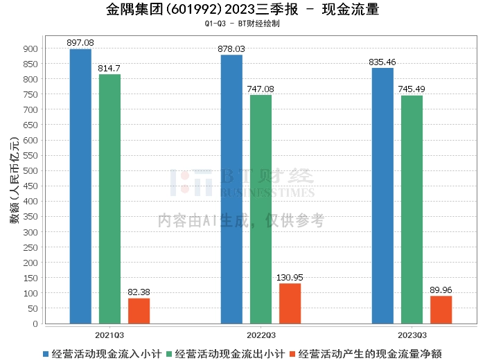 在现金流量方面,金隅集团2023年三季度经营活动产生的现金流量净额为89.96亿元,相比上年同期的130.95亿元有所减少。经营活动现金流入小计为835.46亿元,相比上年同期的878.03亿元有所减少。经营活动现金流出小计为745.49亿元,相比上年同期的747.08亿元基本持平。