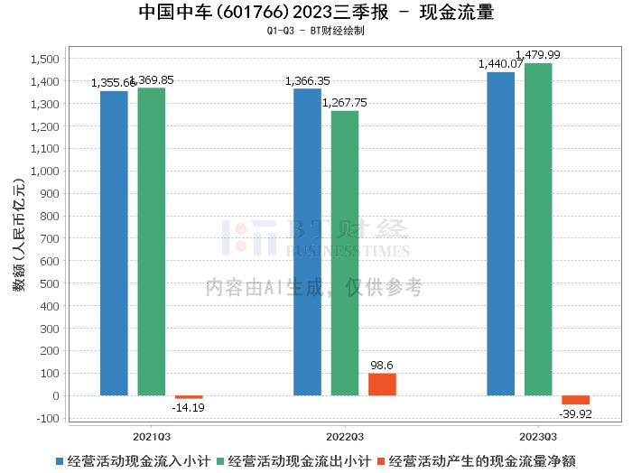 综上所述,中国中车在2023年三季度的经营状况总体稳定,资产总计、净资产和营业利润均实现了增长。然而,经营活动产生的现金流量净额发生了较大的变动,这可能是由于公司购买商品、接受劳务支付的现金较上年同期增加所致。此外,资产负债率有所上升,净资产收益率略有下降,这些都是需要投资者关注的地方。