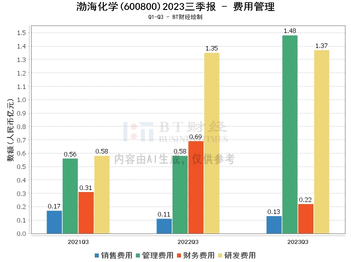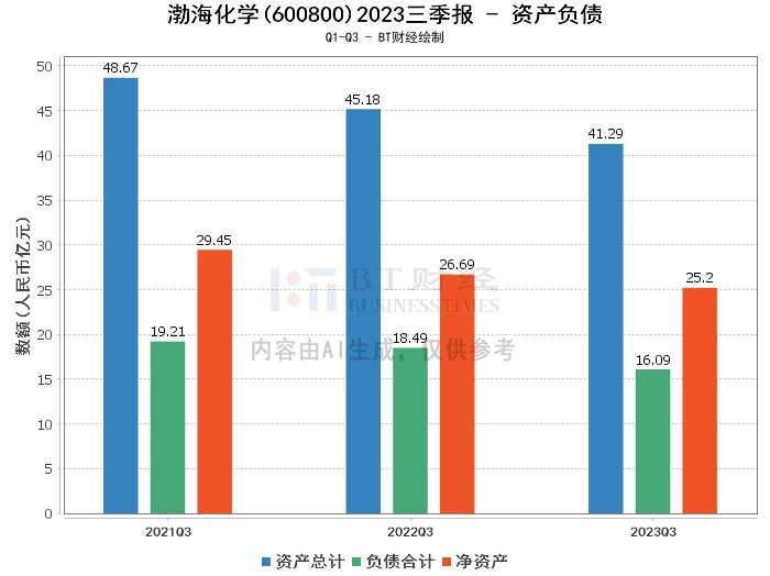 从资产负债方面看,渤海化学2023年三季度末的总资产为41.29亿元,相比上年度末的48.25亿元有所下降。负债合计在本报告期末为16.09亿元,相比上年度末的19.15亿元也有所减少。净资产在本报告期末为25.2亿元,相比上年度末的29.1亿元有所减少。资产负债率在本报告期末为38.97%,相比上年度末的39.69%有所降低。