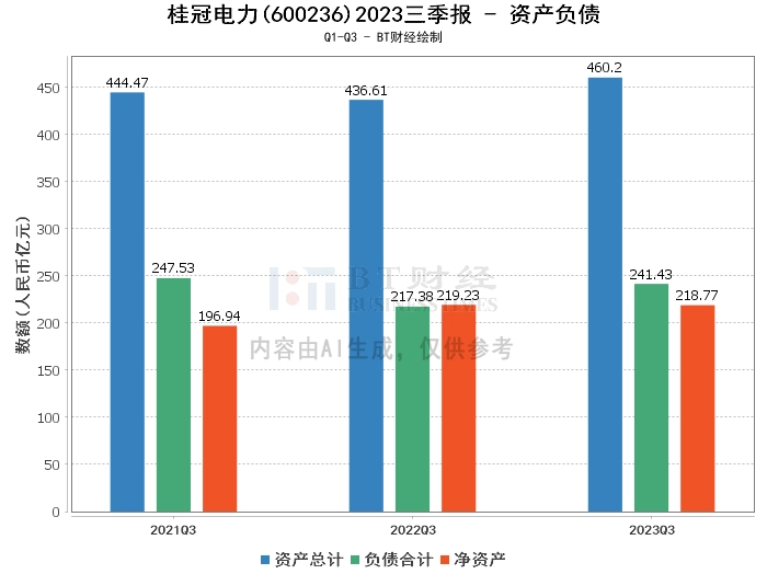 在资产负债方面,桂冠电力2023年三季度末的总资产为460.2亿元,相比上年度末的452.31亿元有所增加。负债合计为241.43亿元,相比上年度末的232.51亿元也有所增加。公司的净资产为218.77亿元,相比上年度末的219.8亿元有所下降。资产负债率为52.46%,相比上年度末的51.4%有所上升。