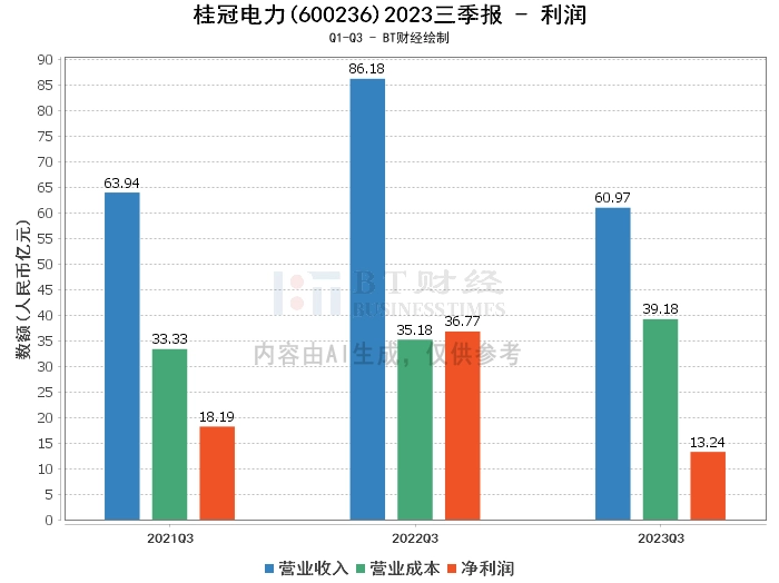 在利润方面,桂冠电力2023年三季度的营业收入为60.97亿元,相比上年同期的86.18亿元有所下降。营业利润为15.41亿元,相比上年同期的42.72亿元大幅下降。营业成本为39.18亿元,相比上年同期的35.18亿元有所增加。净利润为13.24亿元,相比上年同期的36.77亿元大幅下降。