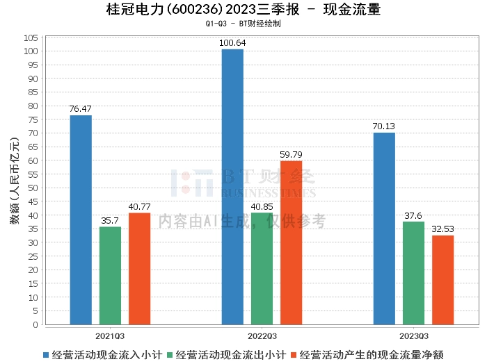 在现金流量方面,桂冠电力2023年三季度经营活动产生的现金流量净额为32.53亿元,相比上年同期的59.79亿元大幅下降。经营活动现金流入小计为70.13亿元,相比上年同期的100.64亿元有所下降。经营活动现金流出小计为37.6亿元,相比上年同期的40.85亿元有所下降。