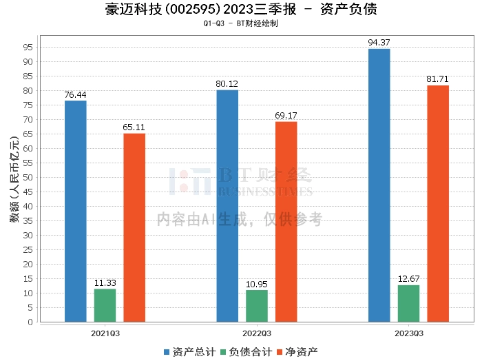 从资产负债方面看,豪迈科技2023年三季报显示,公司资产总计为94.37亿元,相较于上年度末的85.92亿元有所增长。负债合计为12.67亿元,相较于上年度末的12.49亿元略有增加。公司净资产为81.71亿元,相较于上年度末的73.43亿元有所增长。资产负债率为13.42%,相较于上年度末的14.53%有所下降。
