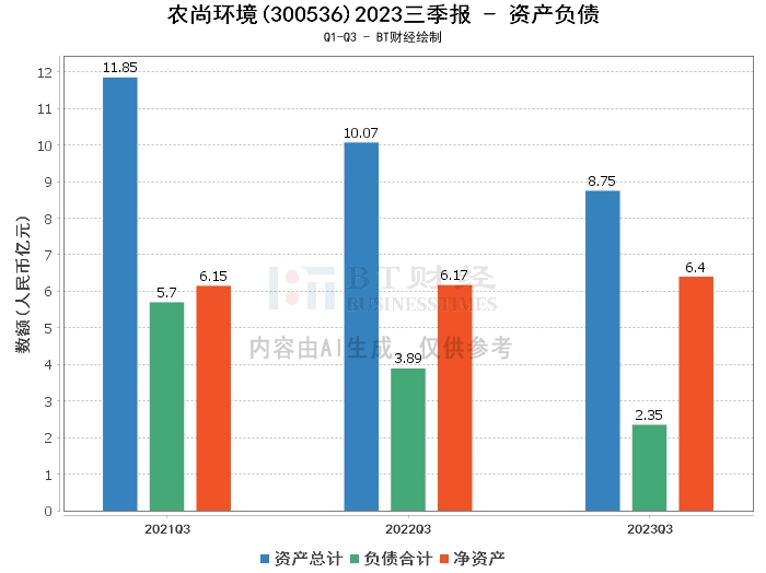 在资产负债方面,2023年三季度末,农尚环境的总资产为8.75亿元,相比上年度末的10.46亿元有所减少。负债合计为2.35亿元,较上年度末的4.07亿元明显减少。净资产为6.4亿元,与上年度末的6.39亿元基本持平。资产负债率为26.85%,较上年度末的38.93%有显著改善。
