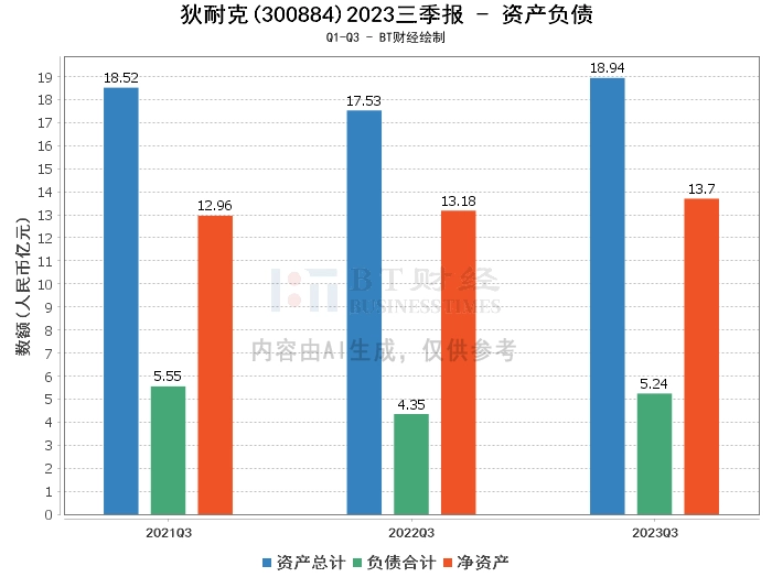 从资产负债方面来看,2023年三季度末,狄耐克公司的总资产为18.94亿元,相比上年度末的18.38亿元有所增长。负债合计为5.24亿元,略高于上年度末的4.98亿元。公司的净资产达到13.7亿元,较上年度末的13.41亿元有所提升。资产负债率为27.65%,略高于上年度末的27.08%。