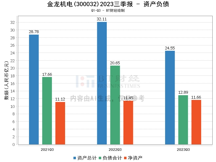 从资产负债方面来看,金龙机电2023年三季度的总资产为24.55亿元,相比上年度末的32.24亿元有所减少。负债合计为12.89亿元,较上年度末的20.53亿元也有所下降。净资产为11.66亿元,与上年度末的11.71亿元相比略有下降。资产负债率为52.51%,较上年度末的63.67%有所降低。