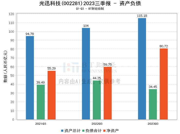 在资产负债方面,光迅科技2023年三季度的总资产为115.18亿元,相比上年度末的99.03亿元有所增加。负债总额为34.45亿元,相比上年度末的37.92亿元有所减少。净资产为80.72亿元,相比上年度末的61.11亿元有所增加。资产负债率为29.91%,相比上年度末的38.29%有所下降。