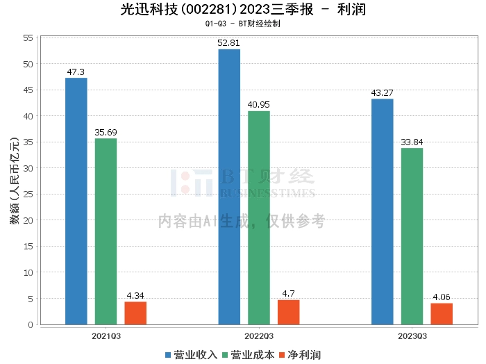 在利润方面,光迅科技2023年三季度的营业收入为43.27亿元,相比上年同期的52.81亿元有所减少。营业利润为4.25亿元,相比上年同期的5.26亿元有所减少。营业成本为33.84亿元,相比上年同期的40.95亿元有所减少。净利润为4.06亿元,相比上年同期的4.7亿元有所减少。
