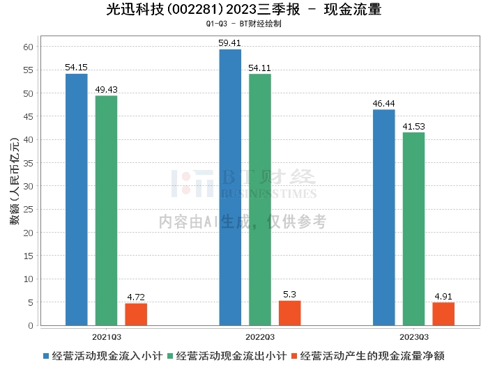 在现金流量方面,光迅科技2023年三季度经营活动产生的现金流量净额为4.91亿元,相比上年同期的5.3亿元有所减少。经营活动现金流入小计为46.44亿元,相比上年同期的59.41亿元有所减少。经营活动现金流出小计为41.53亿元,相比上年同期的54.11亿元有所减少。