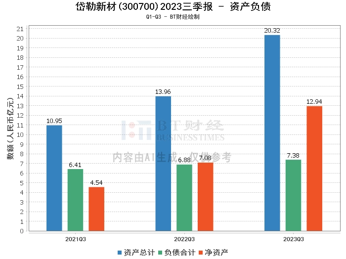 首先,从资产负债方面来看,岱勒新材2023年三季度末的资产总计为20.32亿元,相比上年度末的15.32亿元,增长了32.68%。负债合计为7.38亿元,相比上年度末的7.79亿元有所下降。净资产为12.94亿元,相比上年度末的7.52亿元,增长了71.81%。资产负债率为36.31%,相比上年度末的50.88%,有所下降。