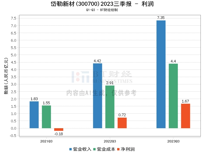其次,从利润方面来看,岱勒新材2023年三季度的营业收入为7.35亿元,相比上年同期的4.42亿元,增长了66.24%。营业利润为1.97亿元,相比上年同期的8499.98万元,有显著增长。营业成本为4.4亿元,相比上年同期的2.91亿元,增长了51.08%。净利润为1.67亿元,相比上年同期的7184万元,增长了130.62%。