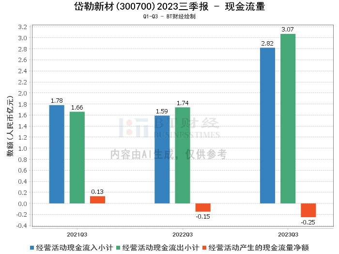 再次,从现金流量方面来看,岱勒新材2023年三季度的经营活动现金流入小计为2.82亿元,相比上年同期的1.59亿元,有所增长。经营活动现金流出小计为3.07亿元,相比上年同期的1.74亿元,有所增长。经营活动产生的现金流量净额为-2463.1万元,相比上年同期的-1506.79万元,减少了63.47%。