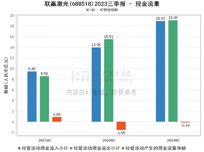 在现金流量方面,年初至本报告期末,联赢激光的经营活动现金流入小计为18.92亿元,相比上年同期的13.95亿元,有所增长。经营活动现金流出小计为19.06亿元,相比上年同期的15.51亿元,有所增长。