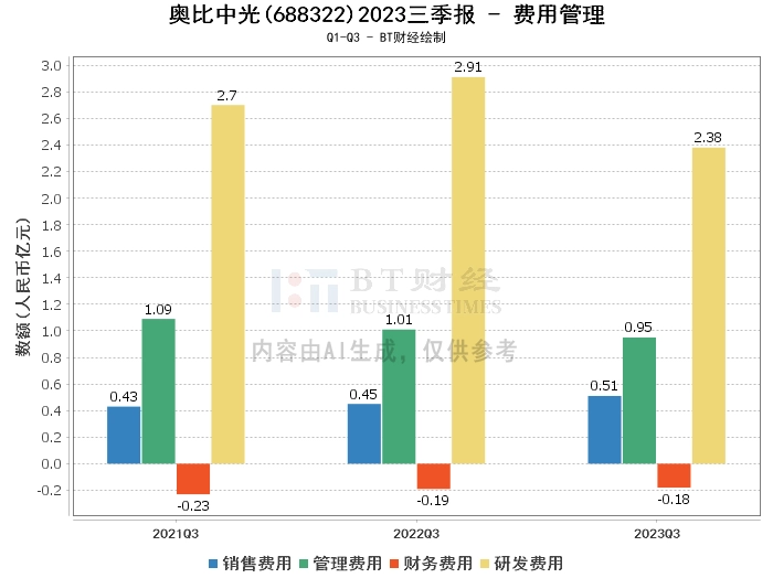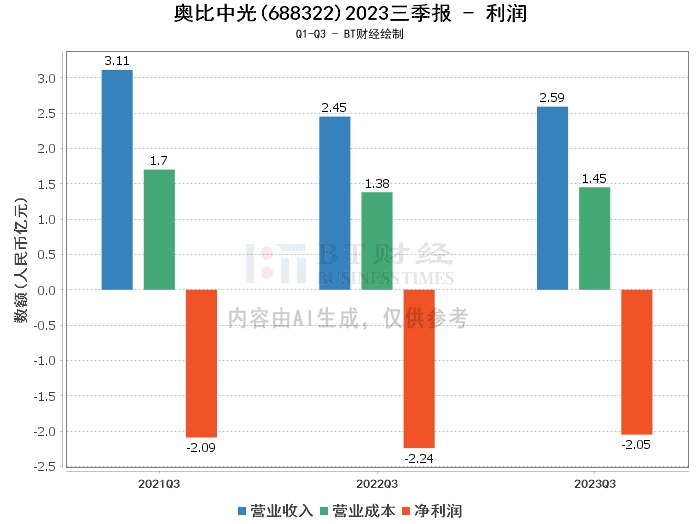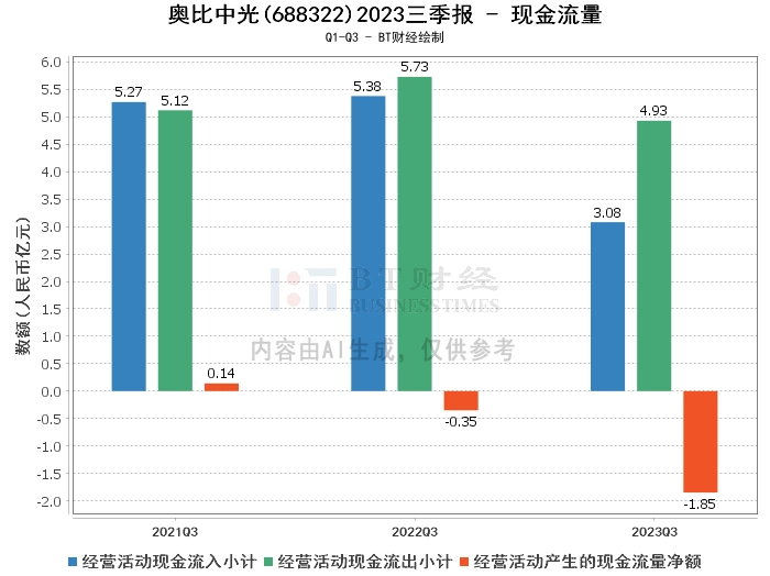 综上所述,奥比中光在2023年三季度的经营状况整体稳定,营业收入和净利润均有所增长,但资产负债率有所上升,现金流量净额为负。主要原因是3D视觉传感器产品销售收入增长,研发费用减少,使用受限的定期存款到期减少及本期销售商品、提供劳务收到的现金减少。