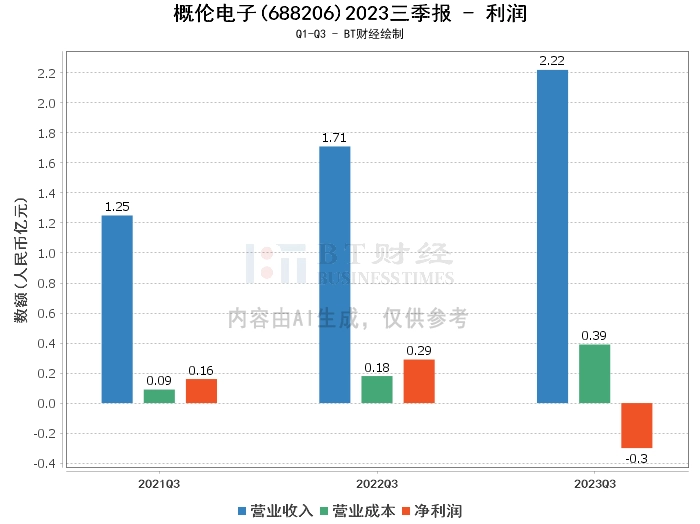 在利润方面,概伦电子2023年三季度的营业收入为2.22亿元,相比上年同期的1.71亿元增长了30.05%。然而,公司的净利润为-3020.21万元,相比上年同期的2928.69万元出现了亏损。这主要是由于计提股份支付费用和研发人员数量增加导致的人员薪酬增加所致。