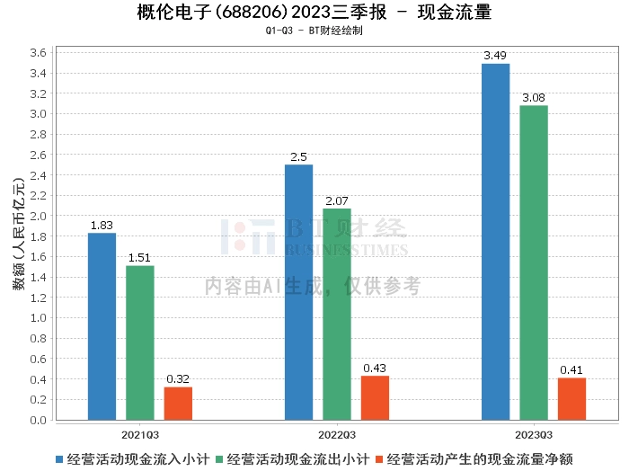 在现金流量方面,概伦电子2023年三季度经营活动产生的现金流量净额为4094.58万元,相比上年同期的4287.54万元略有下降。经营活动现金流入小计为3.49亿元,相比上年同期的2.5亿元有所增加。经营活动现金流出小计为3.08亿元,相比上年同期的2.07亿元有所增加。