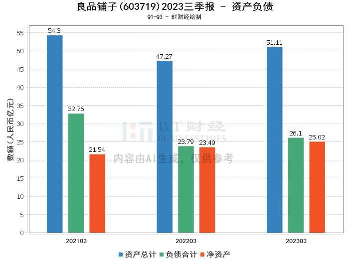 在资产负债方面,良品铺子2023年三季度的总资产为51.11亿元,相比上年度末的50.36亿元有所增长。负债合计为26.1亿元,相比上年度末的26.38亿元有所下降。净资产为25.02亿元,相比上年度末的23.98亿元有所增长。资产负债率为51.06%,相比上年度末的52.38%有所下降。