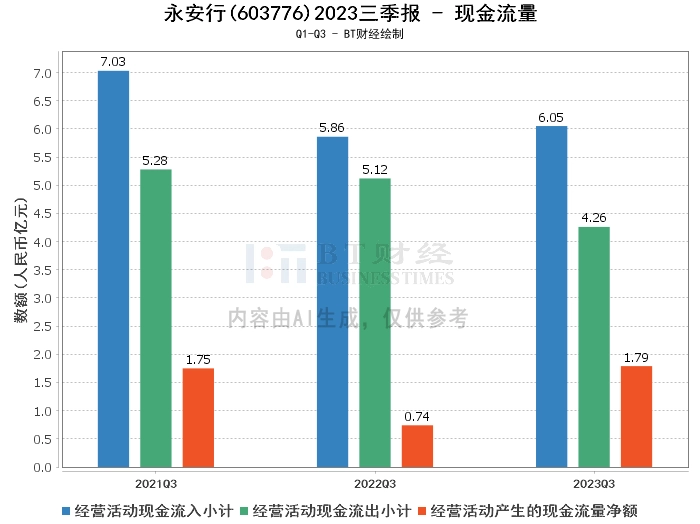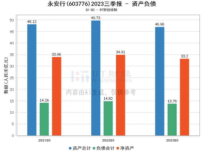 在资产负债方面,永安行2023年三季度末的总资产为46.96亿元,相较于上年度末的47.17亿元略有下降。负债合计为13.76亿元,与上年度末的13.79亿元相差不大。净资产为33.2亿元,较上年度末的33.38亿元略有减少。资产负债率为29.3%,与上年度末的29.24%相比,略有上升。