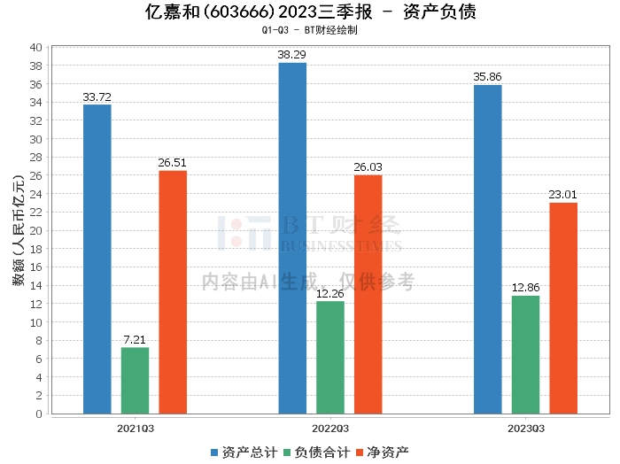 根据2023年三季度财报,亿嘉和公司的总资产为35.86亿元,相比上年度末的37.2亿元有所下降。负债合计为12.86亿元,相比上年度末的13.14亿元略有减少。公司的净资产为23.01亿元,相比上年度末的24.06亿元有所减少。资产负债率为35.85%,略高于上年度末的35.32%。