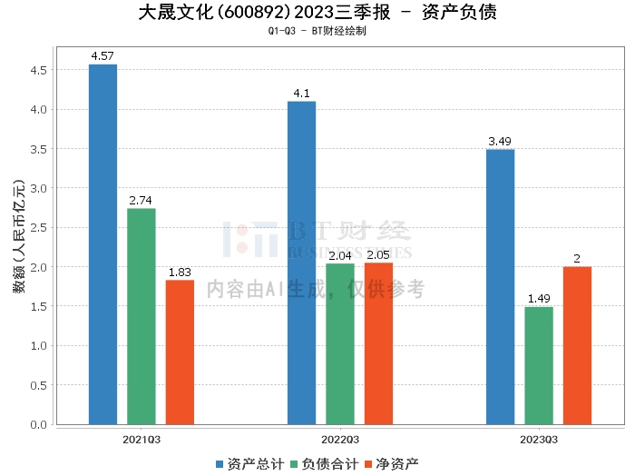 在资产负债方面,大晟文化2023年三季度的资产总计为3.49亿元,相较于上年度末的3.82亿元有所下滑。负债合计为1.49亿元,较上年度末的1.75亿元有所减少。公司的资产负债率为42.74%,较上年度末的45.89%有所降低。净资产为2亿元,略低于上年度末的2.07亿元。